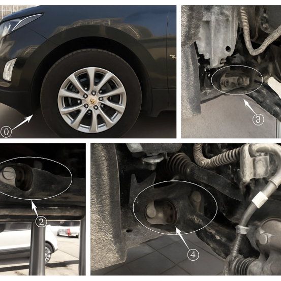 Prejšnji sklop fotografij prikazuje strukturno stanje okvare puše krmilne ročice sprednjega vzmetenja na Chevrolet Equinox. Uporabnikom svetuje, da je mogoče, kot je prikazano na zgornjem diagramu, strukturno komponento z morebitno okvaro pregledati z obračanjem volana do konca v položaj ①. Varnostno preverjanje sklopa puše je treba izvesti s fotografijami, posnetimi na več lokacijah, vključno s položaji ②, in ④.
