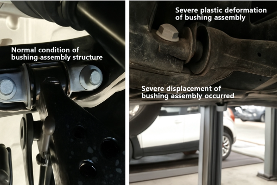 Narejena je primerjava med normalno delujočim sklopom puše krmilne roke (kot je prikazano na spodnji levi sliki) in okvarjenim sklopom puše (kot je prikazano na spodnji desni sliki). Poudarja, da je s primerjavo spodnje leve in desne slike enostavno opaziti, da je vrzel v običajni puši krmilne roke na levi enakomerna in da ne bi smelo biti očitnega upogibanja ali deformacije, kot je prikazano na desni sliki. Če vozilo kaže stanje, prikazano na desni sliki, že med delovanjem predstavlja varnostno nevarnost.